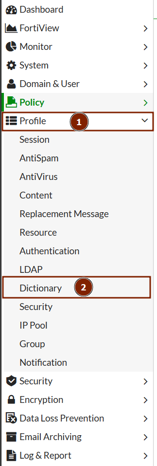 Fortimail - Profile - Dictionary adımlarını takip ediyoruz ve New butonu ile yeni bir Dictionary kuralı oluşturuyoruz.