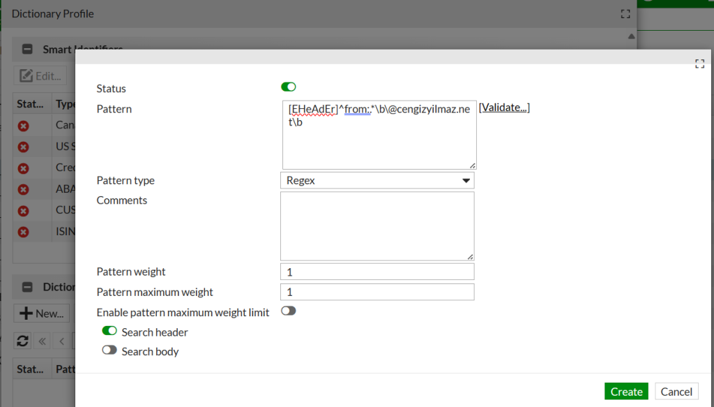 Fortimail‘de SMTP Header kullanarak Spoofing mail engellemek için, yeni bir Dictionary oluşturmamız gerekiyor ve aşağıda paylaştığım Regex‘i aktif hale getirmemiz gerekiyor.