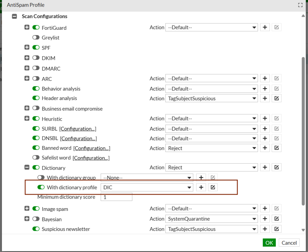 AntiSpam Profile içerisin de Dictionary sekmesini genişlettikten sonra “With dictionary profile” adımından oluşturduğunuz Dictionary kuralını eklemeniz yeterlidir.