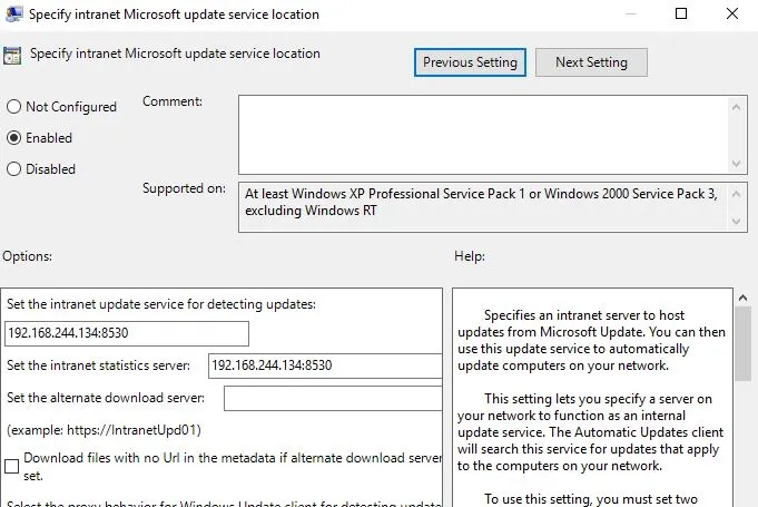 Computer Configuration – Policies – Administrative Templates – Windows Components – Windows Update – Specify intranet Microsoft update service locationseçeneğine geliyoruz.