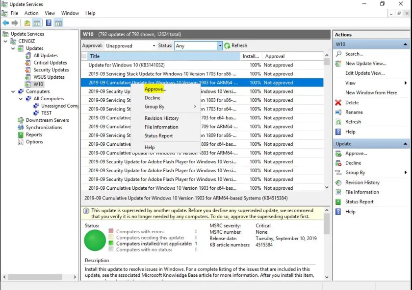 - Dağıtmak istediğiniz güncellemeye sağ tıklayın ve Approve seçeneğini seçin.