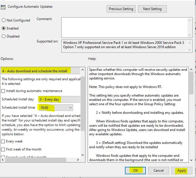 Computer Configuration – Policies – Administrative Templates – Windows Components – Windows Update – Configure Automatic UpdatesadımındaEnabledduruma getirmemiz gerekmektedir.
