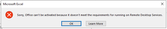 Aslında bu yükleme ve yapılandırma işlemlerine kadar bir sorun yok. Kullanıcılarınız RDS sunucularına bağlandığında office uygulamalarını (Word,Excel vb.) çalıştırdıklarında “Sorry, Office can’t be activated because it doesn’t meet the requirements for running on Remote Desktop Services.” uyarısı ile karşılaşabilirler.