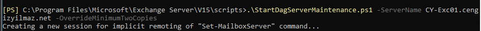 StartDagServerMaintenance script’ini kullanırken “-ServerName” parametresi haricinde “-OverrideMinimumTwoCopies” parametresini de kullandık. Bu parametre, script’in, bir veritabanını başka bir sunucuya taşımadan önce, varsayılan olarak en az iki kullanılabilir kopya kontrolü yapmasını sağlar. Bakım sırasında yalnızca iki node bulunduğundan, bir tanesinde bakım yapılırken sadece bir aktif kopyanız kalır. Bu durumda, “-OverrideMinimumTwoCopies” parametresinin kullanılması zorunludur. Üç veya daha fazla veritabanı kopyanız varsa, bu parametreyi kullanmanıza gerek yoktur.