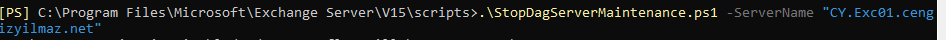 EXC01 sunucusunda bakım işlemi tamamlandığında, sunucuyu bakım modundan çıkarmak için StopDagServerMaintenance script’ini kullanabilirsiniz: