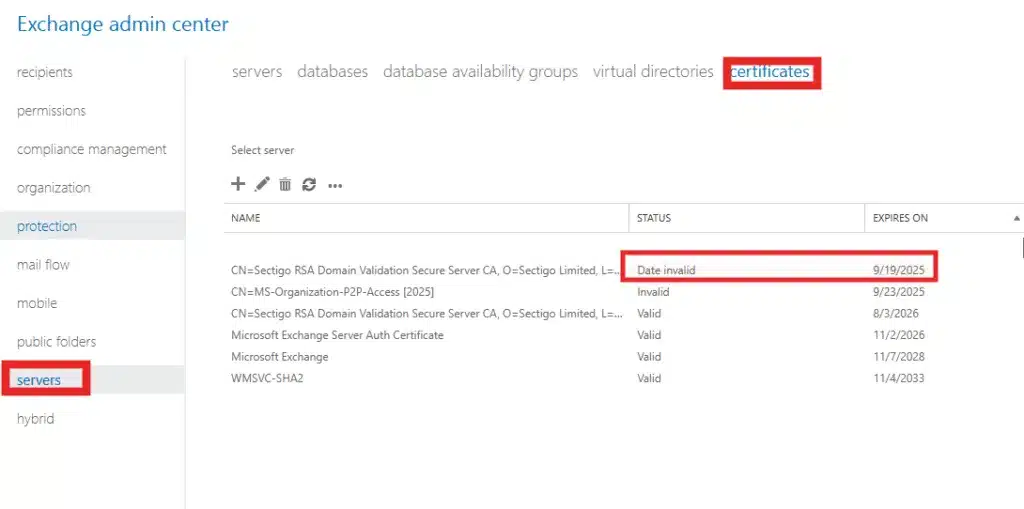 - Global CA’dan alınan sertifikanın süresi dolduğunda, Exchange servislerinde hata almanız normaldir. İşlem yapmadan önce mutlaka yenilenmiş sertifikayı import edin.EAC → Servers → Certificates bölümüne gidin.