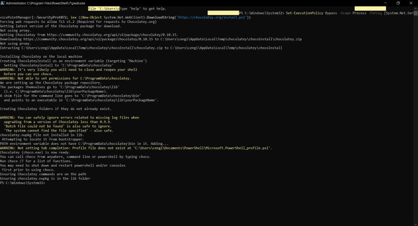 Set-ExecutionPolicy Bypass -Scope Process -Force; [System.Net.ServicePointManager]::SecurityProtocol = [System.Net.ServicePointManager]::SecurityProtocol -bor 3072; iex ((New-Object System.Net.WebClient).DownloadString('https://chocolatey.org/install.ps1'))
