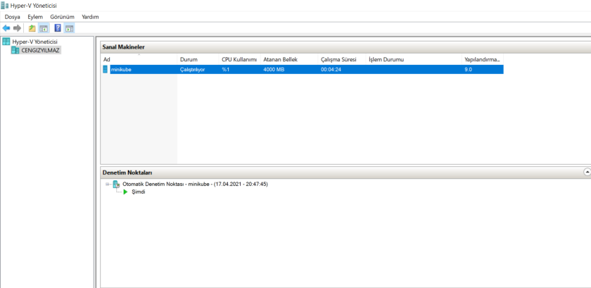 Kurulumlar tamamlandıktan sonra, Hyper-V konsol üzerinden minikube sisteminizi başlatabilirsiniz.