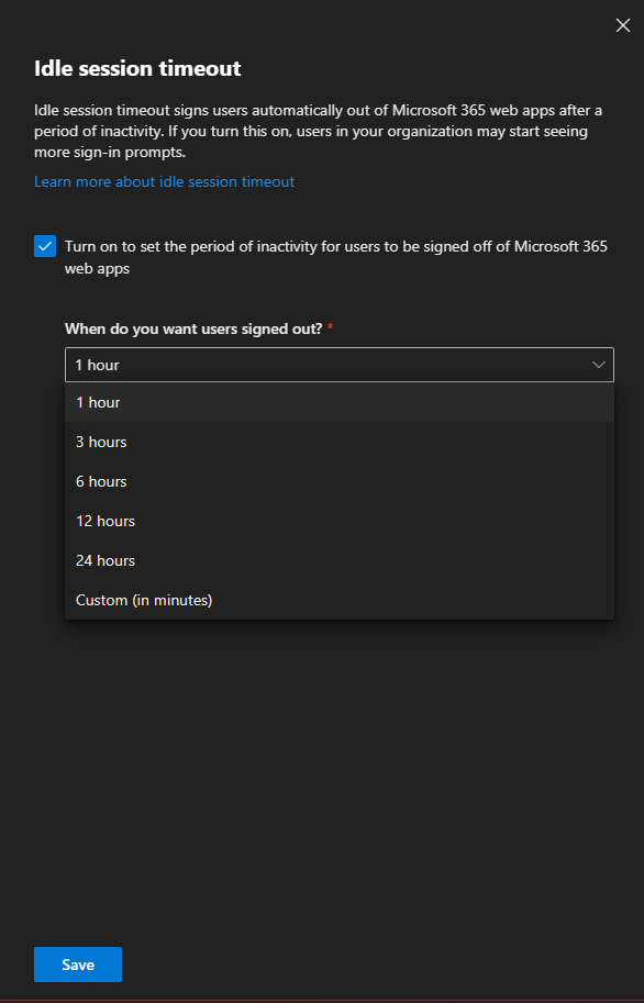 Microsoft tarafından sunulan zaman aşımı süreleri 1 Saat, 3 Saat, 6 Saat, 12 Saat ve 24 Saat olarak hazır gelmektedir. İhtiyacınıza göre bu sürelerden birini seçebilir veya ‘Custom (in minutes)’ seçeneği ile dakika bazında kendi sürenizi belirleyebilirsiniz.