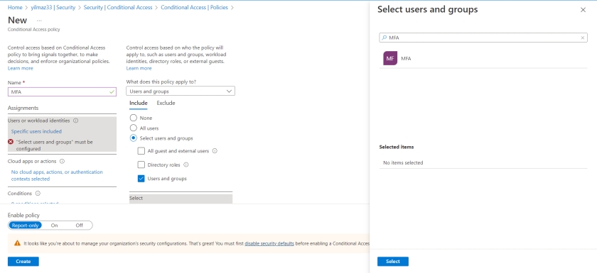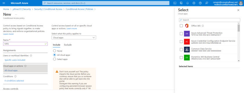 - Cloud apps or actions seçeneğinden hangi uygulamalar için geçerli olacağını seçin. Örneğin, belirlediğiniz MFA grubunun tüm uygulamalarda oturum açarken MFA kullanmasını zorunlu kılın.