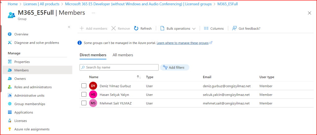 Lisans Grup oluşturma ve Grup üyesi ekleme işlemlerini tamamladık. Entra ID üzerinde Licensed Groups içerisinde bulunan Lisans grubunu açtığımız zaman grup üyelerini görüntülenmesi gerekmektedir.