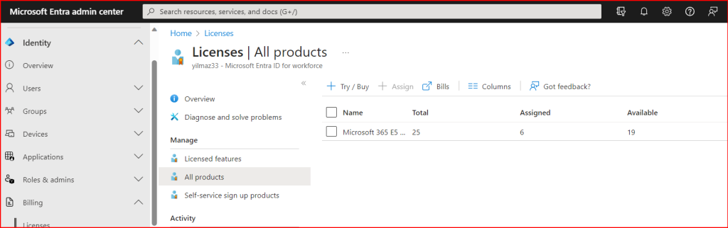 Entra ID - Billing - Licenses - All Products adımlarını takip etmemiz yeterlidir.