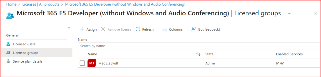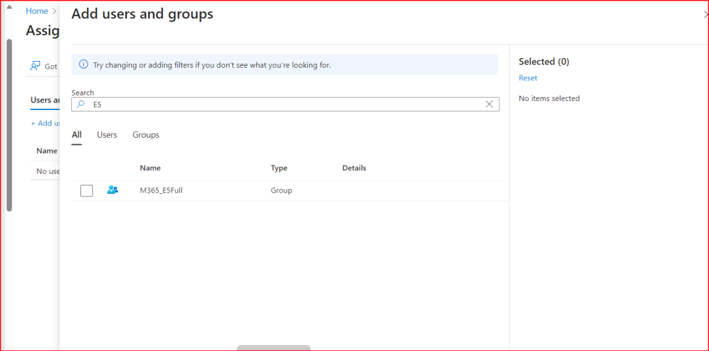 Assign butonu ile Sync etmiş olduğumuz M365_E5Full” grubunu işaretliyoruz.