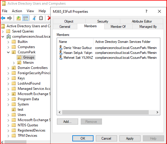 On-Premises AD üzerinden grup üyelerini eklememiz gerekmektedir, bu işlem için ADUC kullanabilirsiniz. Mersin OU’su içerisinde kullanıcılarımı M365_E5Full grubuna üye olarak ekliyorum.
