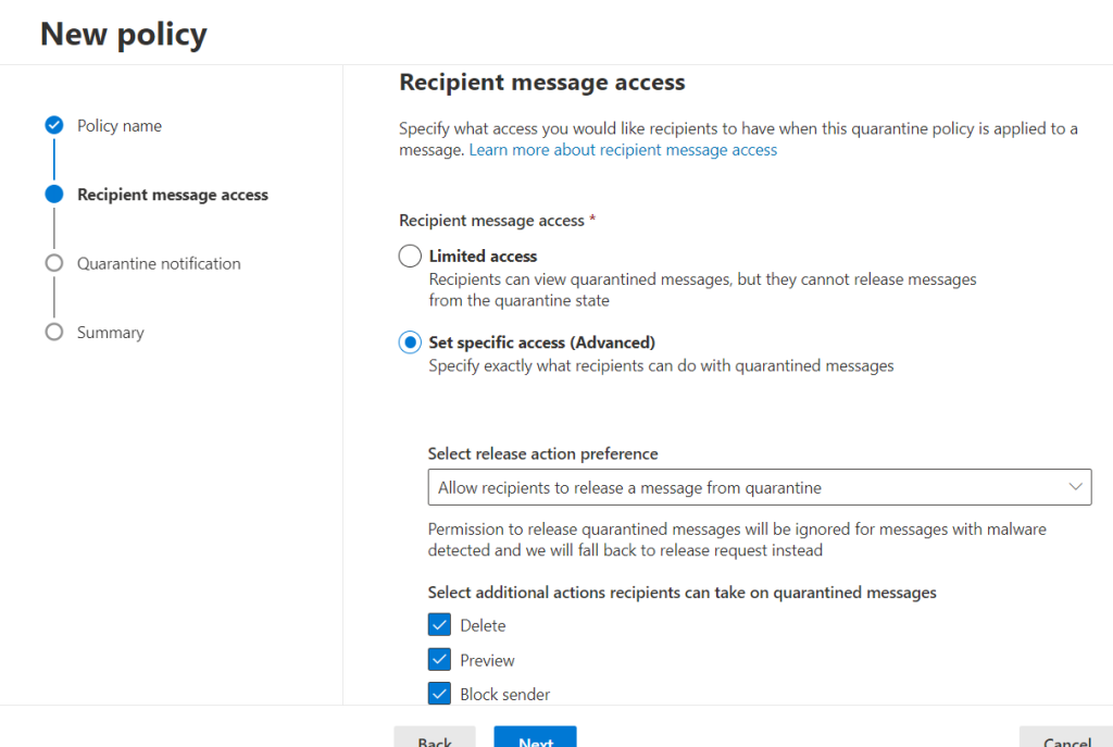 Set Specific access seçiyorum ve kullanıcılarıma Delete, Preview ve Block Sender yetkisi tanımlıyorum.