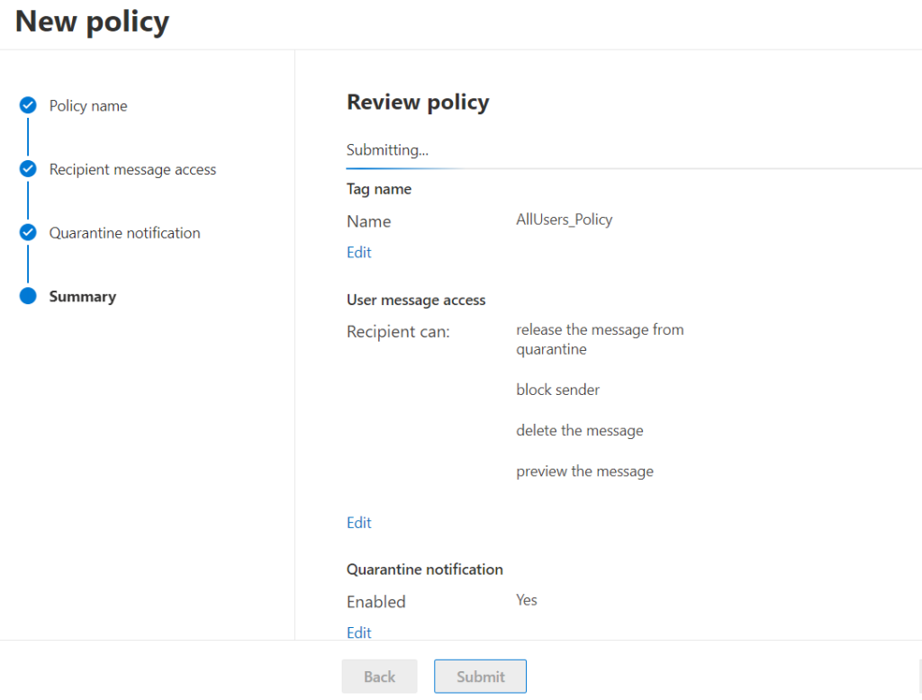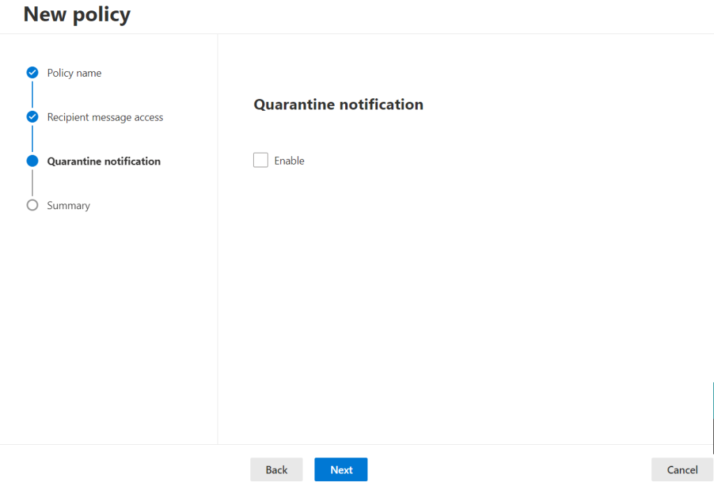 Karantina bildirimleri, AdminOnlyAccessPolicy veya DefaultFullAccessPolicy adlı yerleşik karantina bildirimlerinde açık değildir. Karantina bildirimleri, kuruluşunuzda varsa NotificationEnabledPolicy adlı yerleşik karantina ilkesinde etkinleştirilir. Aksi takdirde, karantina ilkelerinde karantina bildirimlerini etkinleştirmek için yeni bir karantina ilkesi oluşturmanız ve yapılandırmanız gerekir.