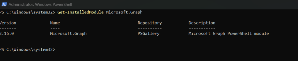 Microsoft Graph API modülünün yüklü olduğunu kontrol etmek için get-installedmodule komutunu kullanabilirsiniz.