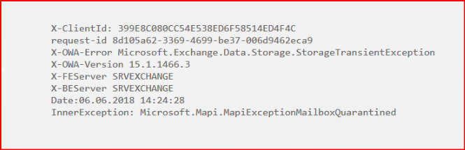 Exception type: Microsoft.Mapi.MapiExceptionMailboxQuarantined