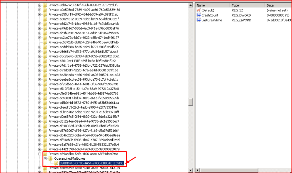 Öğrenmiş olduğumuz GUID değerini QuarantinedMailboxes” altında bulmamız ve silmemiz gerekiyor, ilgili silme işlemi gerçekleştikten sonra karantina durumu ortadan kalkacaktır.