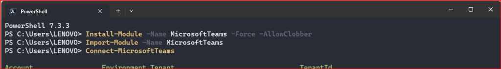 Install-Module -Name MicrosoftTeams -Force -AllowClobber