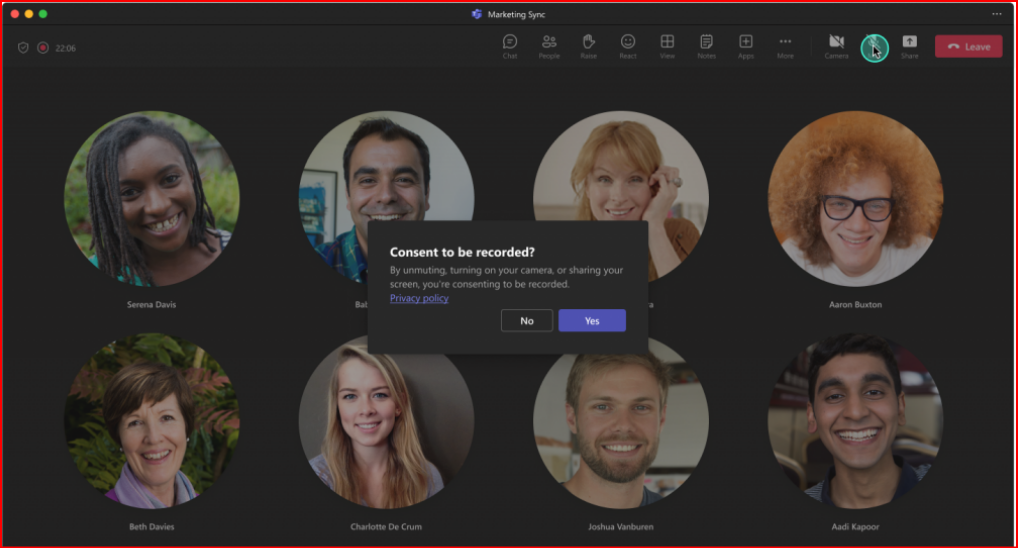 Teams now supports an Explicit Recording Consent meeting policy. When the policy is applied, the Teams meeting window will request explicit consent of all participants to be recorded. Before a user gives consent, the user’s audio, video, and screenshare/consent-share won’t be captured in the meeting recording.