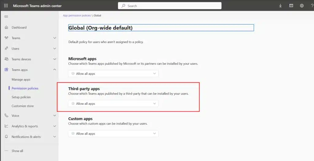- Allow all apps: Kullanıcılar, Teams uygulama mağazasını kullanarak üçüncü taraf uygulamalar yükleyerek kullanabilir.