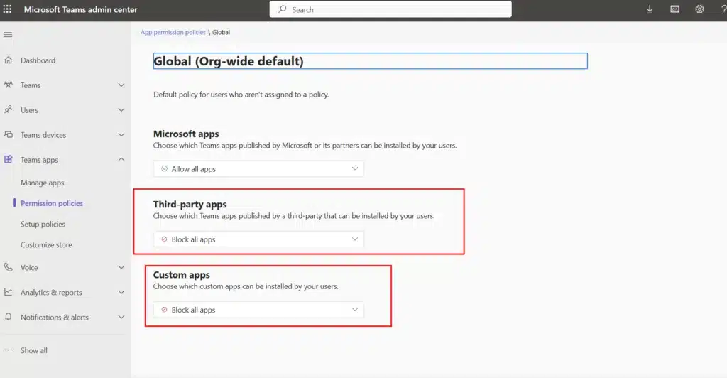 - Block all apps: Teams uygulama mağazasında bulunan üçüncü taraf uygulamaların hepsi engellenir.