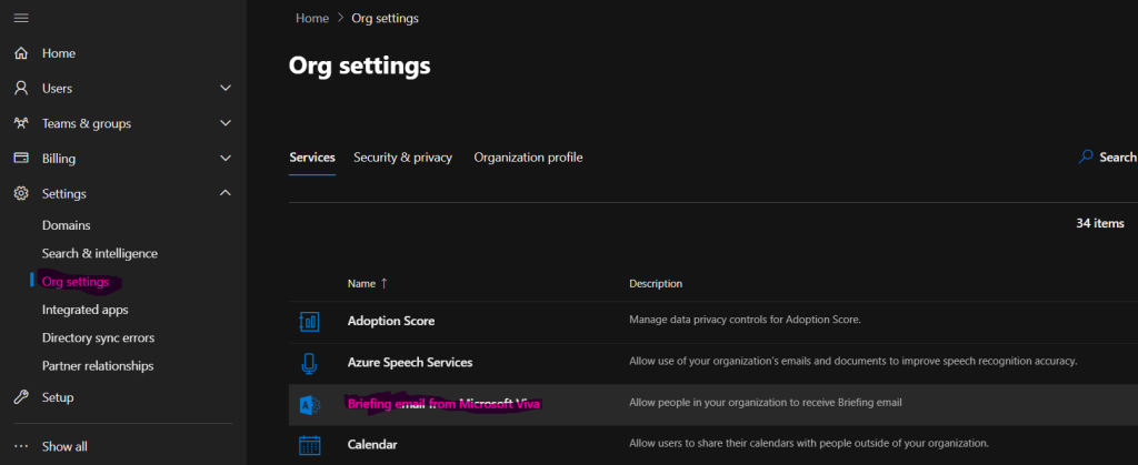 Sol menü üzerinden Settings - Org Settings -Briefing email from Microsoft Viva adımlarını takip etmemiz gerekmektedir.