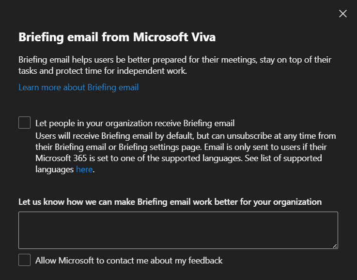 Daha sonra Let people in your organization receive Briefing email (Kuruluşunuzdaki kişilerin Brifing e-postası almasına izin ver seçeneğinin) işaretini kaldırmanız gerekmektedir.