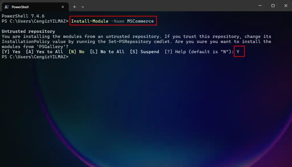PowerShell Gallery üzerinden kuracağımız MSCommerce modülü aşağıdaki gibidir;