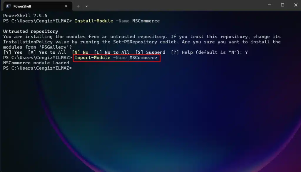 MSCommerce Kurulumu tamamlandıktan sonra, modülü PowerShell oturumunuza dahil edebilmek için aşağıdaki komutu kullanmanız gerekmektedir.