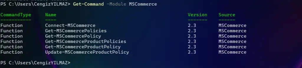 PS C:UsersCengizYILMAZ> Get-Command -Module MSCommerce