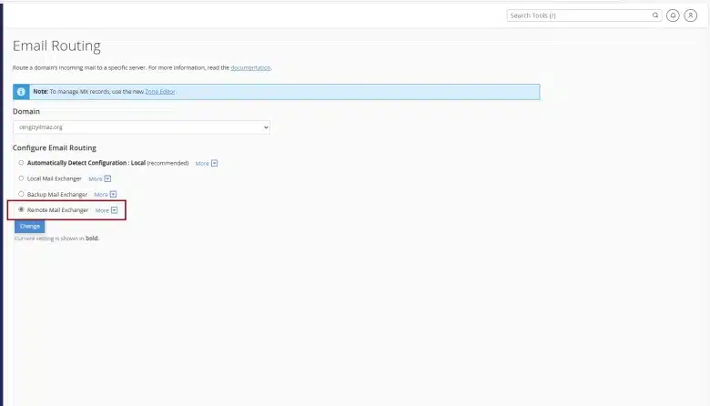 - Configure Email Routing bölümünde ise Remote Mail Exchanger seçimi yapmanız gerekmektedir.