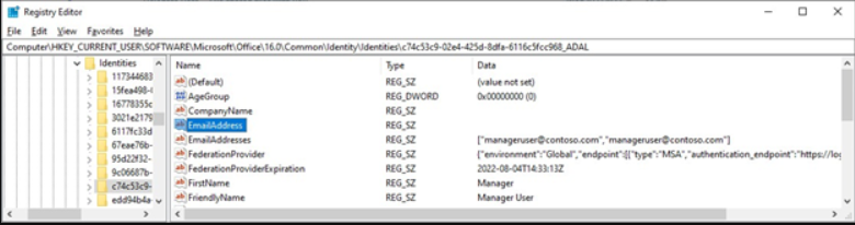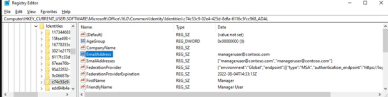 Registry path: ComputerHKEY_CURRENT_USERSOFTWAREMicrosoftOffice16.0CommonIdentityIdentities
