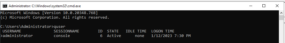 Ortamınıza bağlı kullanıcıların Remote Desktop Services (RDS) oturumlarını başlattığı zamanı öğrenmek için, Command Prompt (CMD) üzerinden “quser” komutu kullanılabilir. Bu komut, bağlı olan tüm kullanıcılar hakkında bilgi verir ve kullanıcıların oturum açma süresini gösterir.