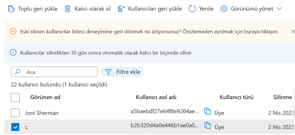 Silinen kullanıcılar bölümünde, kullanıcıların silindiği tarihi ve kalıcı olarak silineceği tarihleri görebilirsiniz.