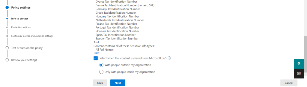 Policy oluşturmanın ilk adımı kategori seçimi yapmaktır, [Microsoft](https://cengizyilmaz.net/understanding-the-discrepancies-between-exchange-mailbox-sizes-and-exported-pst-file-sizes/)‘un oluşturduğu kategorileri kullanabildiğinzi gibi Custom seçeneği ile kendi kategorinizide oluşturabilirsiniz. Yada ülke seçimi yaparak filtreleme yapabilirsiniz.
