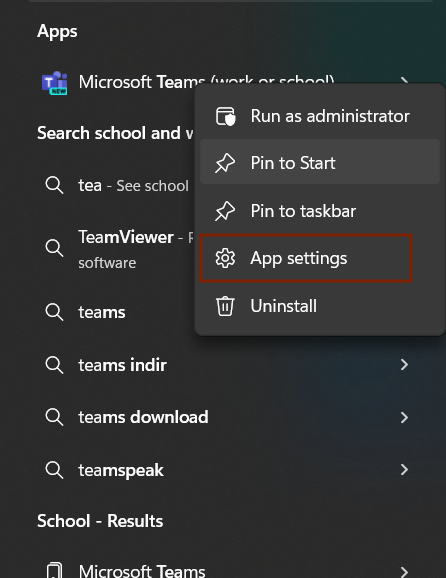 - Microsoft Teams simgesine sağ tıklayın ve “Uygulama ayarları”nı seçin.