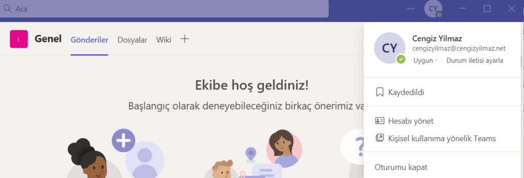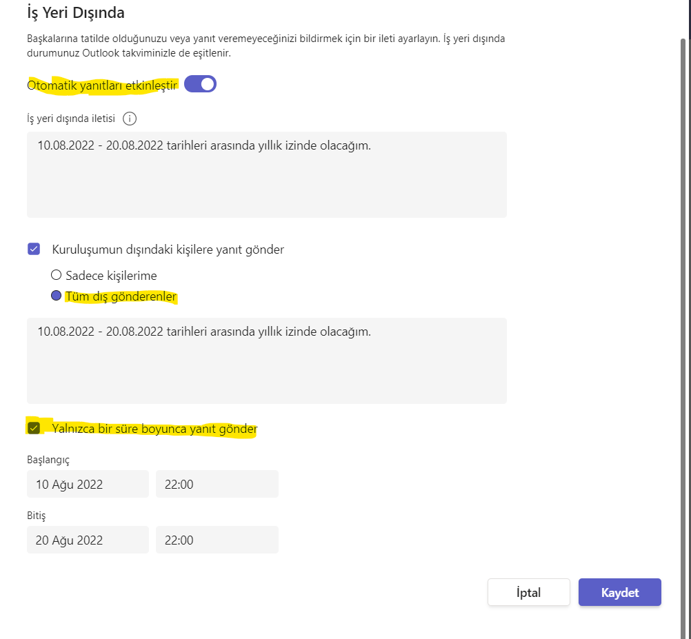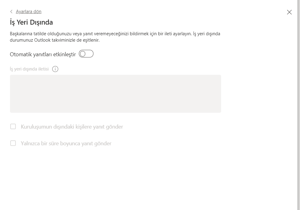 Outlook tarafından otomatik olarak doldurulan Out of Office iletisinden hariç olarak bu işlemi Teams penceresi üzerinden de yapabilmekteyiz.