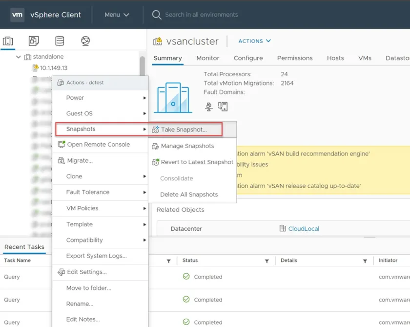 vSphere Client GUI, sanal makinelerinizde bulunan VMware Snapshot‘ları yönetmek için sezgisel bir arayüz sağlar. Bir sanal makineye sağ tıklayıp “Snapshot > Take Snapshot” seçeneğini seçerek kolayca bir anlık görüntü oluşturabilirsiniz. Bu arayüz, Snapshot’ları görsel olarak yönetmek isteyen kullanıcılar için yararlıdır.