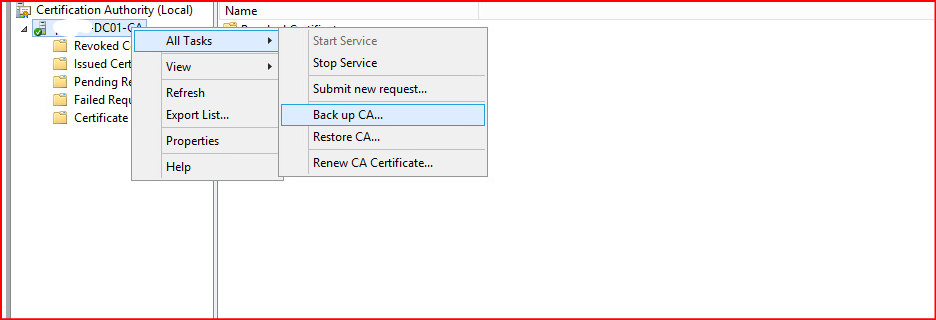 Sol konsol da bulunan CA sunucusuna sağ tıkladıktan sonra All Task - Backup up CA adımlarını takip ediyoruz.