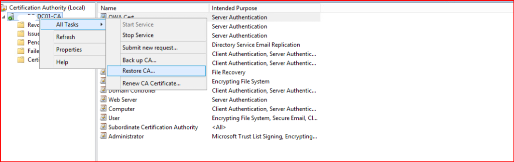 Aşağıdaki komut ile Kuruluş CA’sı yüklemek ve Backup aldığınız sertifikayı kullanmak için aşağıdaki komutları kullanabilirsiniz.