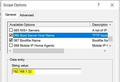 - Scope Options bölümün de “066 – Boot Server Host Name” kuralı aktif hale getiriyoruz