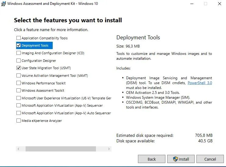 Bu araçlar arasından, kurulum için özellikle “Deployment Tools” ve “User State Migration Tool (USMT)” bileşenlerini seçiyoruz. Seçimimizi yaptıktan sonra ‘Install’ butonuna tıklayarak kurulum sürecini başlatıyoruz.