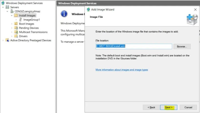 Windows Deployment Services – Install Images – Add Image adımını takip edebiliriz. Burada oluşturmuş olduğumuz WIM dosyasını gösteriyoruz.