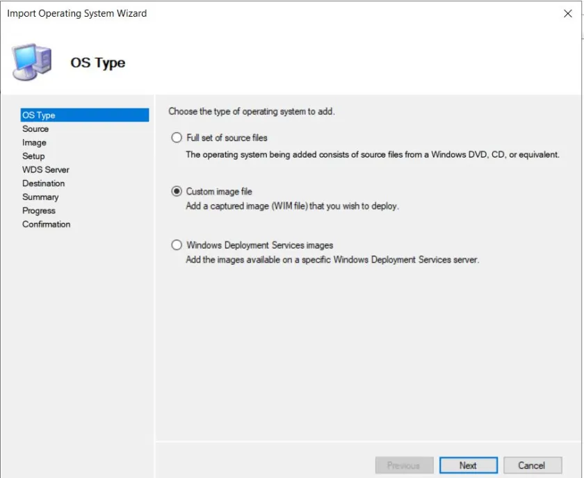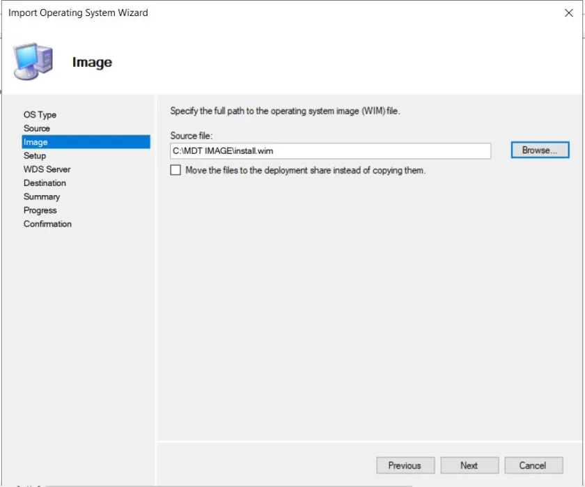 “Custom image file” seçeneği ise, önceden oluşturulmuş ve WIM formatında kaydedilmiş olan özelleştirilmiş master (referans) imajınız varsa kullanılır. Bu yöntem, özelleştirilmiş ayarlar, uygulamalar veya sürücüler içeren imajları MDT‘ye dahil etmek için idealdir.