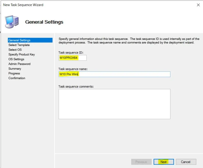 Task sequence ID ve Task Sequence Name bölümlerini isteğimize göre dolduruyoruz.