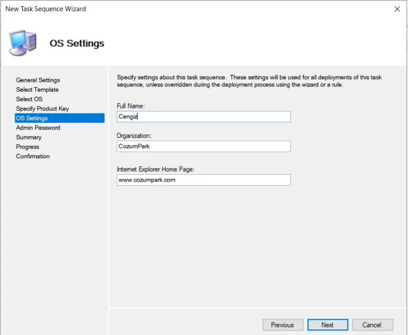 OS Settings bölümünde Full Name, Organizationve Internet Explorer Home Page bölümlerinde düzenlemeler sağlayabiliyorsunuz.