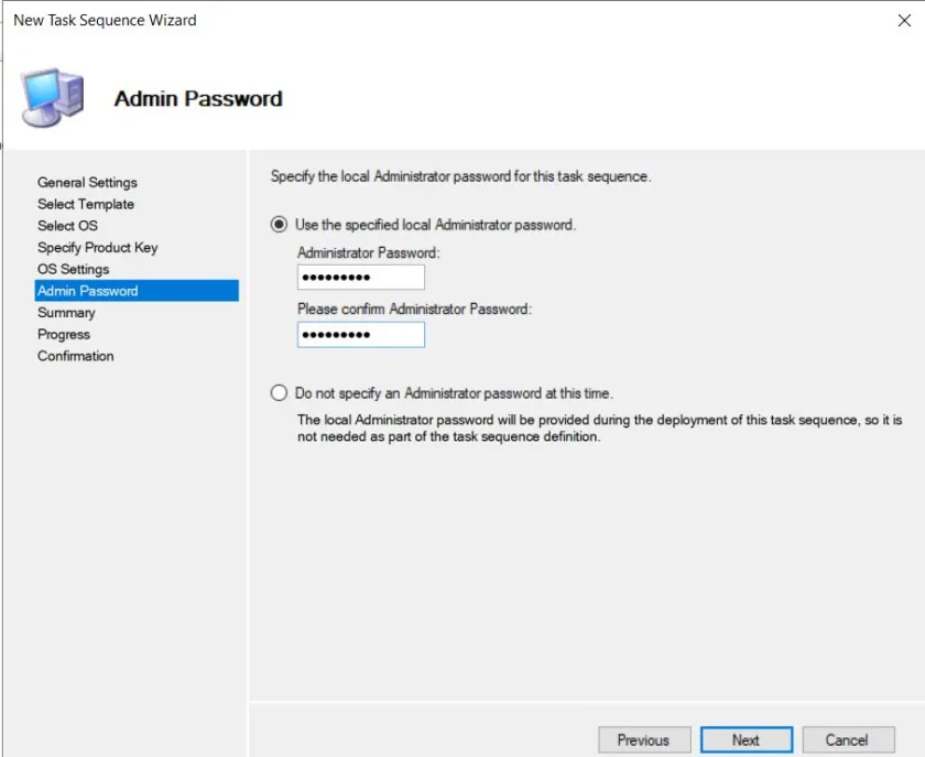 Bir sonraki adım “Admin Password” bölümüdür. Bu aşamada, kurduğumuz sistemin yerel yönetici (local admin) şifresini belirlememiz gerekmektedir. Eğer “Do not Specify an administrator password at this time” seçeneğini işaretlerseniz, sistem kurulum sırasında sizden bir yerel yönetici şifresi girmenizi isteyecektir. Ancak, şifreyi kurulum sırasına bırakmak yerine, bu adımda güvenli bir şifre belirlemeyi tercih ediyorum.