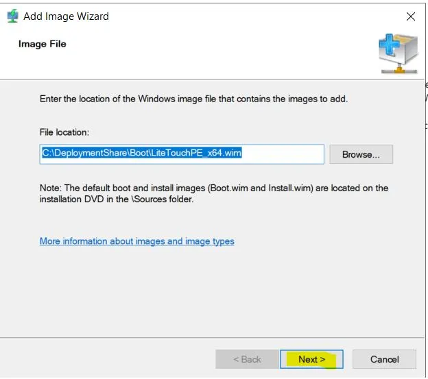İkinci adım olarak, Windows Deployment Services (WDS) içinde “Boot Images” bölümüne giderek sağ tıklayıp “Add Boot Image” seçeneğini seçiyoruz. Bu işlem “Add Image Wizard” ekranının açılmasını sağlar. Burada, sistemi başlatmak için kullanılacak boot imajının yerini göstermemiz gerekiyor. Daha önce Deployment Share’i güncellediğimizde, Microsoft Deployment Toolkit (MDT) otomatik olarak boot imajlarını oluşturmuştu. Bu aşamada, MDT tarafından oluşturulan boot imaj dosyasını seçmeliyiz.